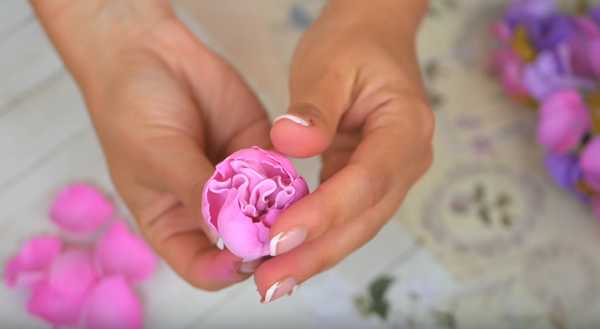 Сформировать все лепестки при помощи утюга, после этого листик скрутить в гармошку и растереть по спирали. Боковинки некоторых образцов можно закрутить назад. Сборку начинают сразу на проволоке. Первый ряд делают из элементов одного размера, для формирования каждого следующего ряда берут лепестки разной конструкции. Серединку пиона заполняют клеем для придания выпуклости. На завершающем этапе приклеивают чашелистик и декорируют проволоку лентой и листиками.