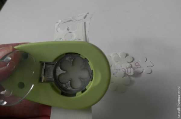 Недавно я приобрела два фигурных дырокола и влюбилась в них 🙂 За один просмотр фильма (а именно тогда я и делаю мелкую и кропотливую работу), я успеваю сделать небольшую кучку маленьких цветочков, которые так замечательно могут преобразить любую композицию и любое украшение.