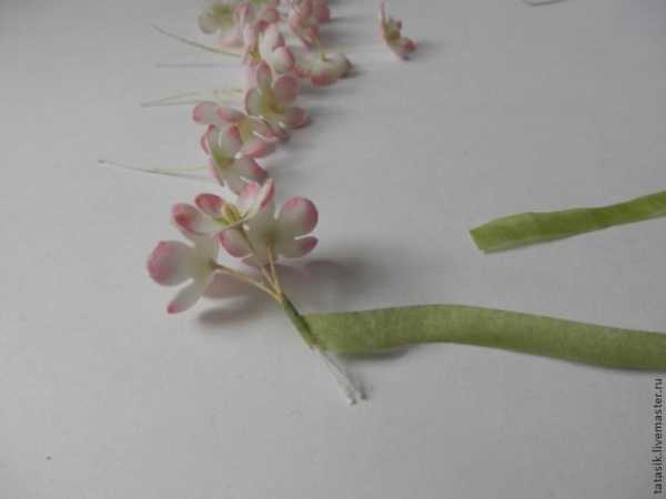 Каждый лепесток прогреть на подошве утюга, после этого затонировать с одного края пастелью фиолетового цвета, а серединку синим тоном. Всё хорошо растушевать. Аналогично обработать обе стороны каждого элемента. Далее сформировать цветочки: на одном цветке соединить 4 тычинки и закрепить 2 лепестками. На одном стебельке может быть 3−4 цветочка, а в гортензии бывает до 35 соцветий. Собираются они на проволоке, которую декорируют лентой зелёного цвета.