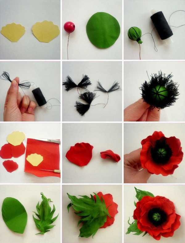 Вырезать 5 лепестков мака по шаблону размером 60×50 мм. Для придания формы его необходимо сложить в гармошку и прокрутить в разные стороны, немного вытягивая серединку. Сборку начинают с равномерного фиксирования тычинок у основания бусинки, затем приклеивают 3 лепестка, после этого дополняют объём ещё двумя. Из фома зелёного цвета нужно вырезать листики длиной около 80 мм, зафиксировать их на проволоке и задекорировать ножку зелёной лентой.