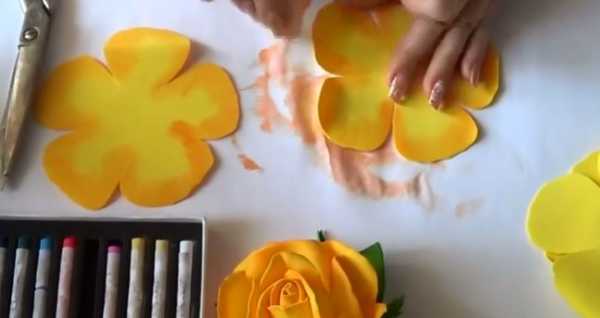 Можно слегка оттонировать края лепестковВ интернете можно найти много схем для изготовления роз своими руками: это обычная розочка, маленькая, интерьерная, пионовидная, многоцветная, с переходом оттенков, в виде бутона и в букетной группе.