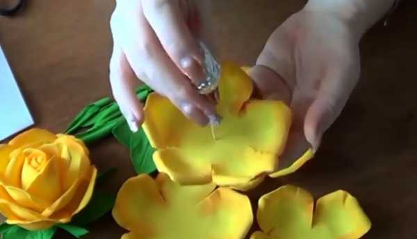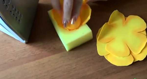 Фоамиран прекрасно тонируется, под действием тепла утюга ему можно придавать любую форму. Очень ценно, что после охлаждения изделие прекрасно сохраняет форму, не мнется, не боится влаги. Изменить форму цветка можно только в том случае, если повторно нагреть материал. Лепестки цветов сделанных из фоамирана тонкие, мягкие, нежные – они очень похожи на настоящие.