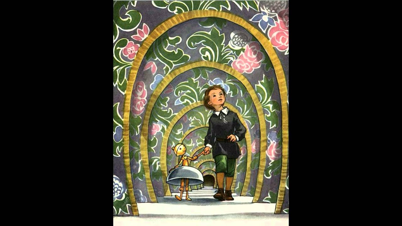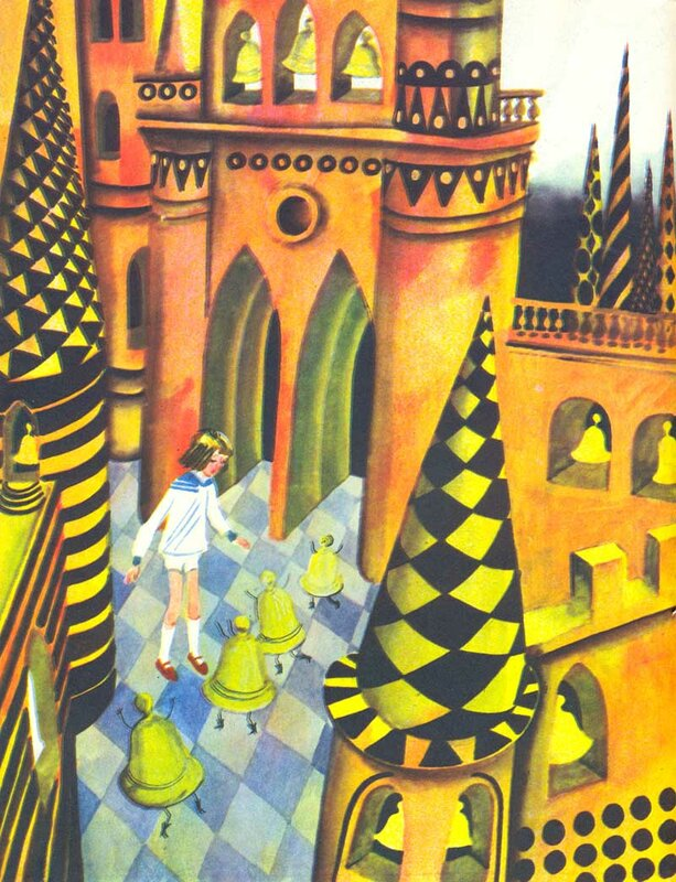 Миша учтиво поклонился; мальчик-колокольчик взял его за руку, и они пошли. Тут Миша заметил, что над ними был свод, сделанный из пёстрой тисненой бумажки с золотыми краями. Перед ними был другой свод, только поменьше; потом третий, ещё меньше; четвёртый, ещё меньше, и так все другие своды, чем дальше, тем меньше, так что в последний, казалось, едва могла пройти головка его провожатого.