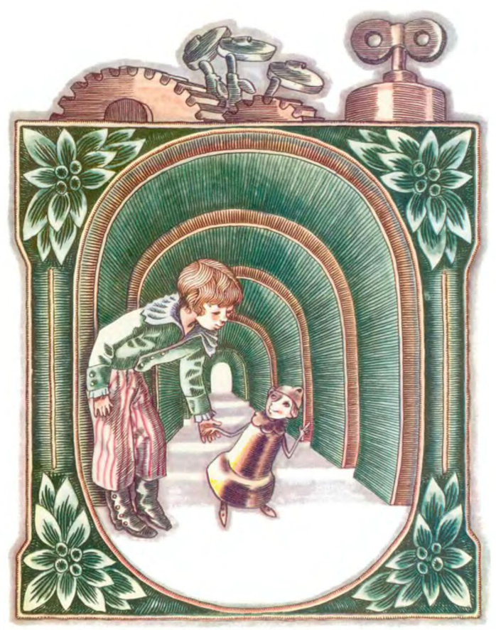 Между тем музыка играет да играет; вот всё тише да тише, как будто что-то цепляется за каждую нотку, как будто что-то отталкивает один звук от другого. Вот Миша смотрит: внизу табакерки отворяется дверца и из дверцы выбегает мальчик с золотою головкой и в стальной юбочке, останавливается на пороге и манит к себе Мишу.