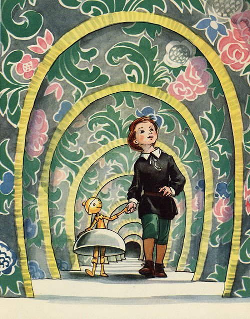С этими словами Миша побежал к дверце и с удивлением заметил, что дверца ему пришлась точь-в-точь по росту. Как хорошо воспитанный мальчик, он почёл долгом прежде всего обратиться к своему провожатому.