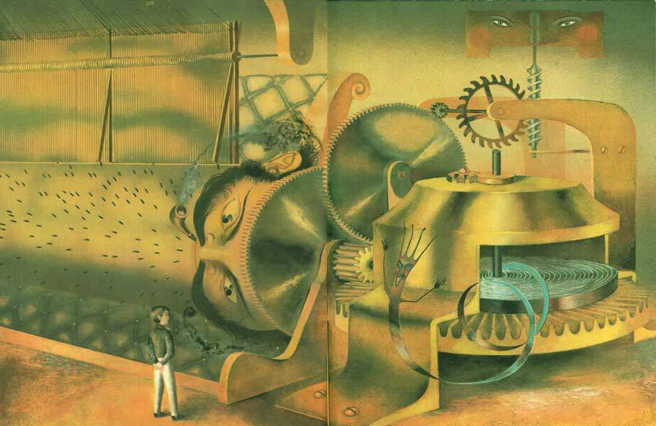 В одно мгновение пружина развернулась с силой, валик яростно закрутился, молоточки быстро застучали, колокольчики заиграли дрянь, и вдруг пружина лопнула. Все замолчало, каток остановился, молотки упали, колокольчики свернулись в сторону, солнце повисло, дома сломались… Тут Миша вспомнил, что папа не велел ему трогать пружины, испугался и….. проснулся.
