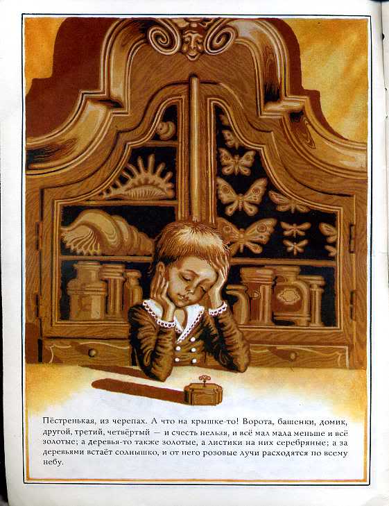 Папа поставил на стол табакерку.«Иди сюда, Миша, посмотри», — сказал он. Миша был послушным мальчиком; сразу оставила игрушки и пошла к папе. Да и посмотреть было на что! Какая прелестная табакерка! пестрый, из черепахи. А что на крышке! Ворота, башенки, дом, другой, третий, четвертый — и не счесть, и все маленькое, и маленькое, и все золотое; и деревья тоже золотые, и листья на них серебряные; и солнце встает за деревьями, и от него розовые лучи разливаются по всему небу.