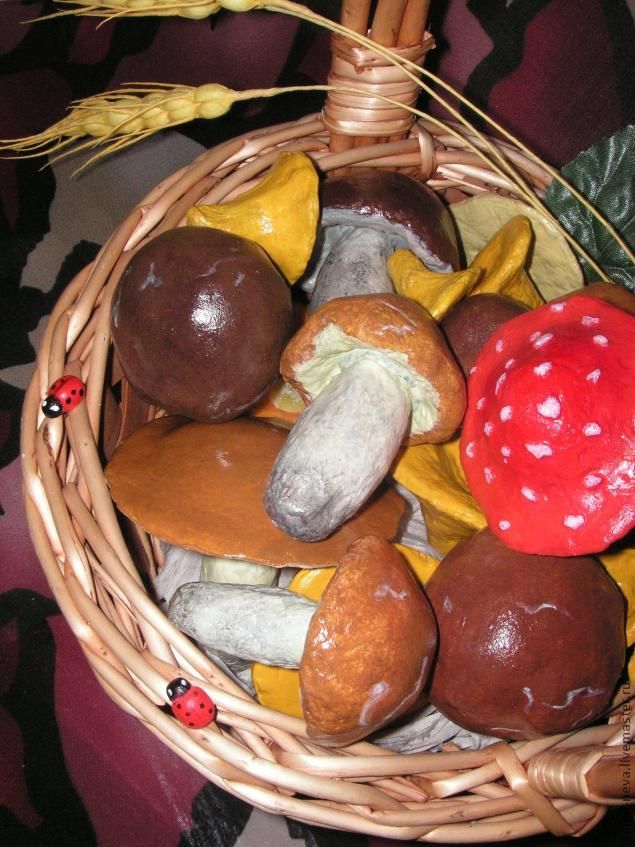 Готовое изделие покрывают лаком. После этого грибы становятся совсем как настоящие, яркие, с подлинными цветами.