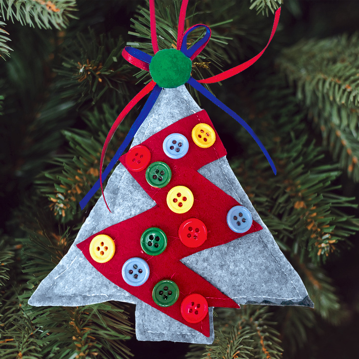 Чтобы сделать такое новогоднее украшение, нужно вырезать из фетра темно-зеленого цвета два небольших куска треугольной формы. Украсьте их яркими пуговицами и блестящими разноцветными пайетками.