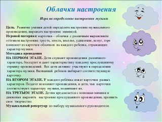 Для определения настроения музыки на начальном этапе мы используем «Солнышко и тучка». Имеются два больших образца и индивидуальные карточки на каждого ребенка. Эту игру можно применять уже в младшем возрасте.
