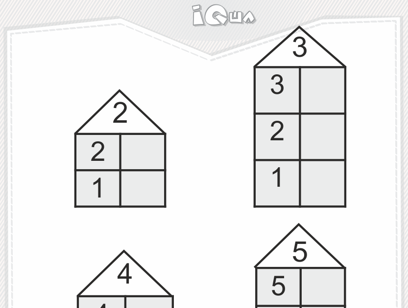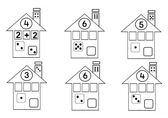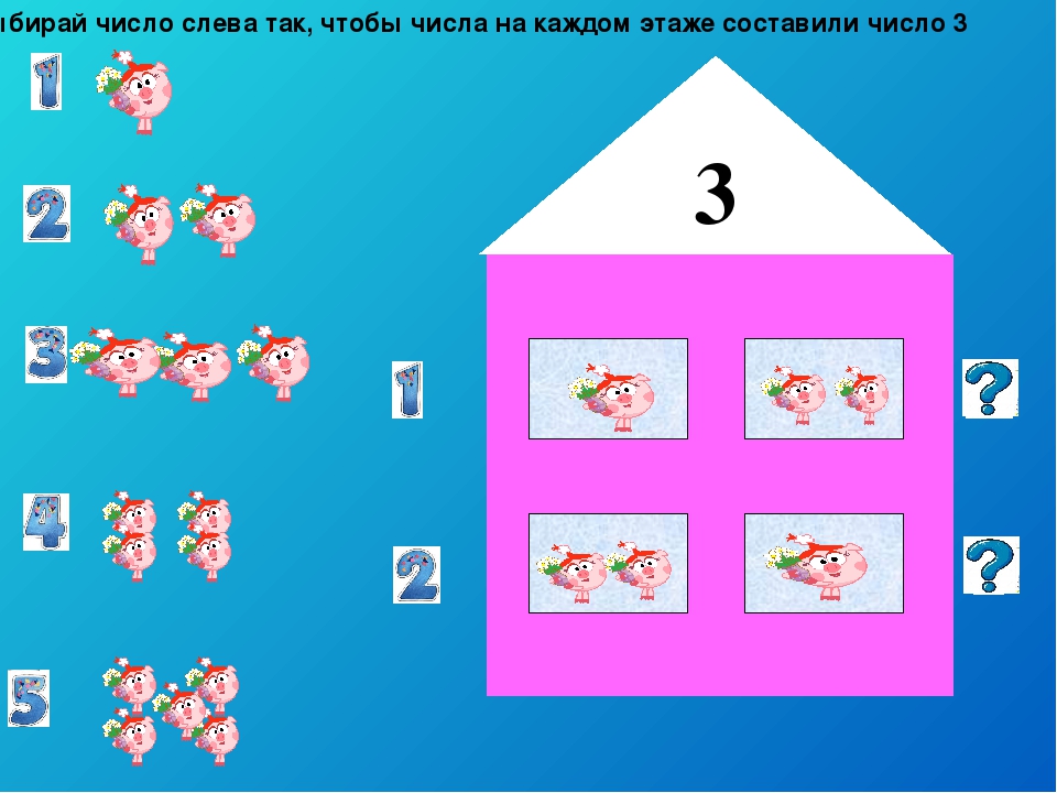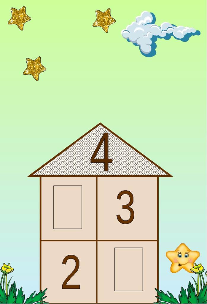 Цифра на крыше обозначает количество жильцов на каждом этаже. Ребенок должен подобрать и поставить цифру на второе окошко.