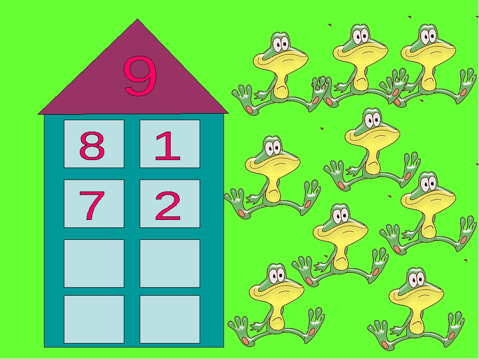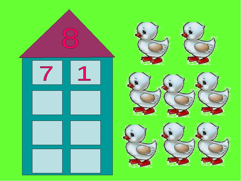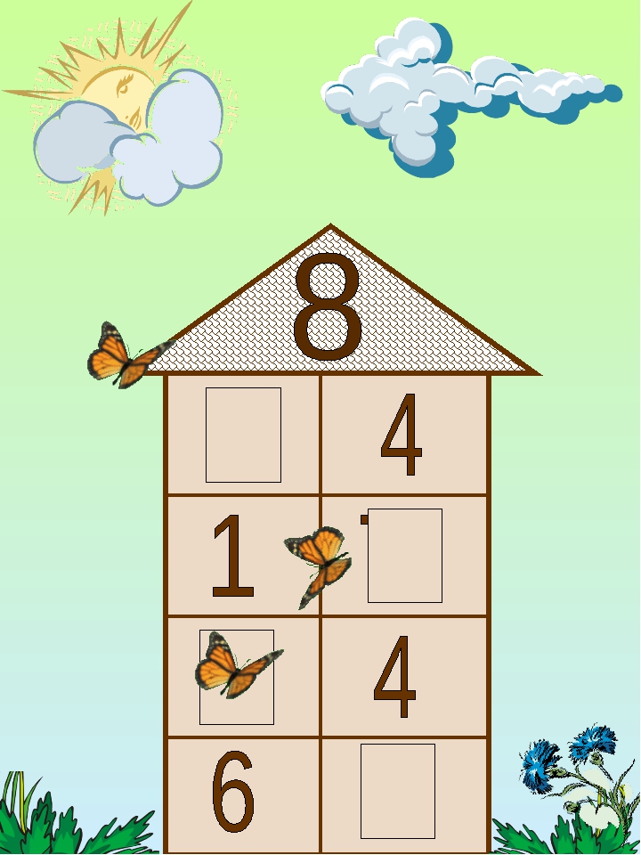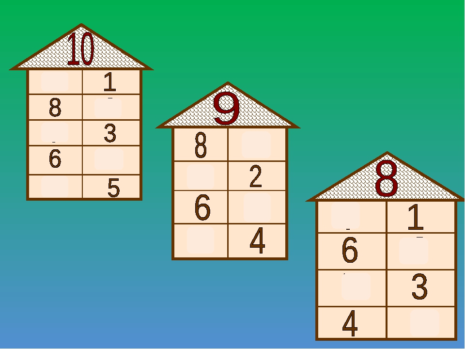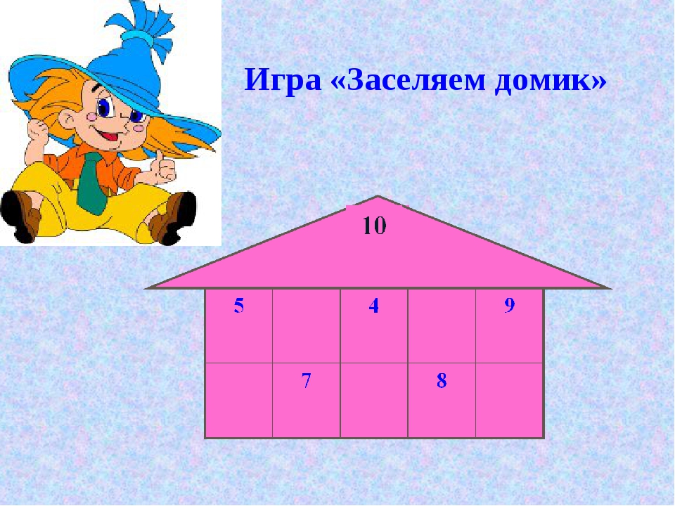 Ведущий кладет перед ребенком большую карточку с домиком. В каждом из домиков живет определенная цифра. Ребенку предлагается подумать и сказать, из каких чисел она состоит. Пусть ребенок назовет все варианта. После этого он может показать все варианты состава числа.