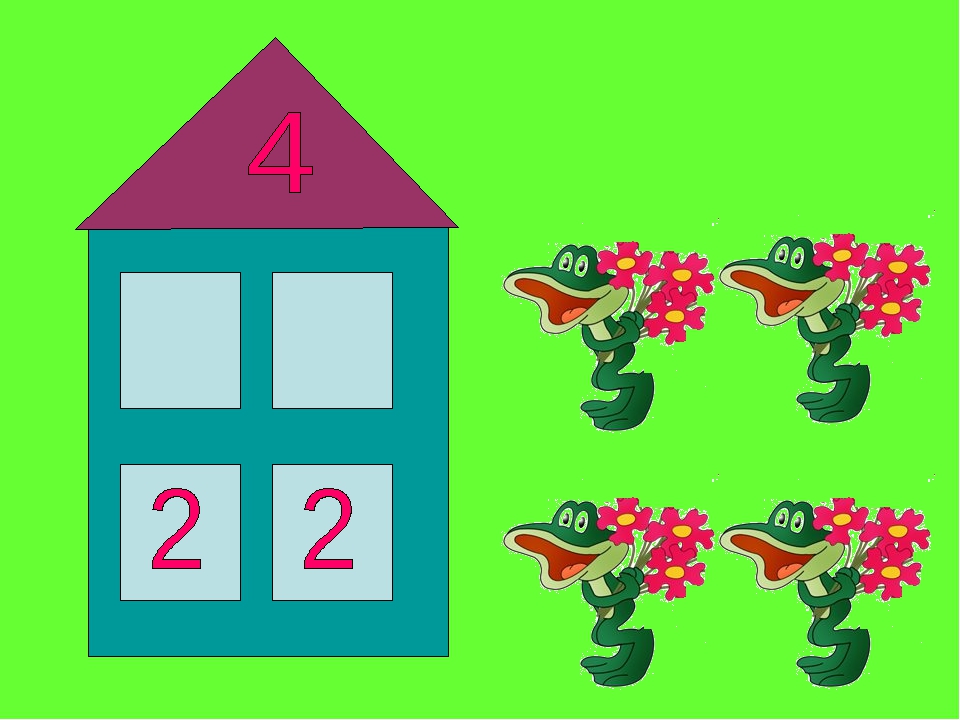 Материалы: Демонстрационный: карточки для иллюстрации решения задач, домик для закрепления состава числа 4, игра «Числовые домики», цифры и знаки, карточка с цифрой 4 для демонстрации написания.