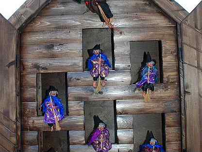 Игра эстафетная. В качестве ступы используется простое ведро, в качестве метлы – швабра. Участник встает одной ногой в ведро, другая остается на земле. Одной рукой он держит ведро за ручку, а в другой руке – швабру. В таком положении необходимо пройти всю дистанцию и передать ступу и метлу следующему.