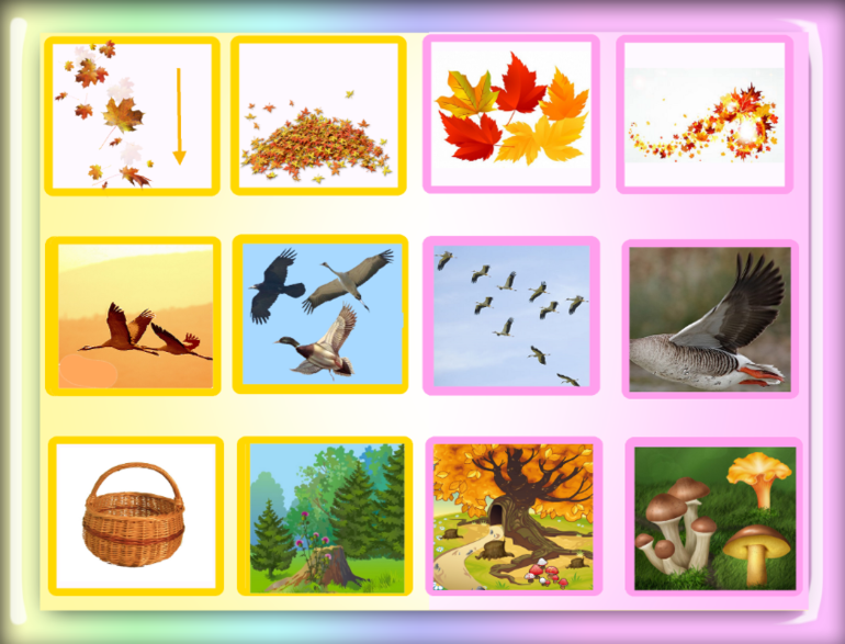 Атрибуты: набор парных картинок на осеннюю тематику, где в каждой паре картинок на одной нарисовано целое изображение, а на другой его отдельная часть в виде отдельного предмета (например: птица на осенней ветке — осенняя ветка).