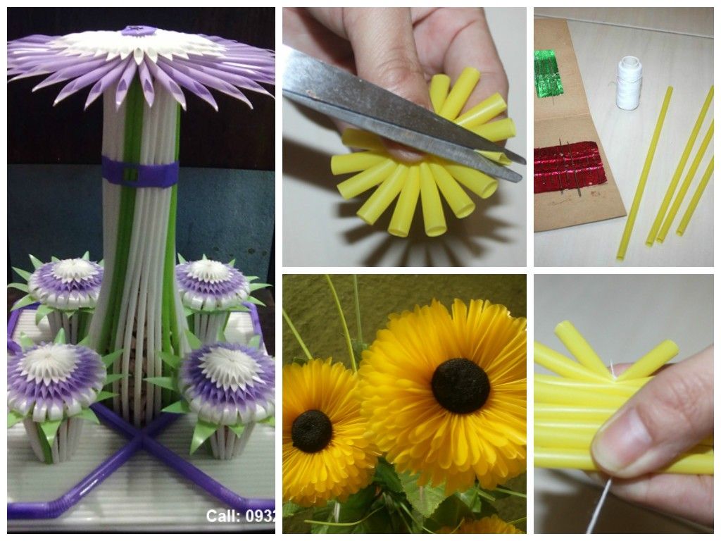 Теперь следует перейти к изготовлению цветка. Для этого все трубочки от сока нужно разрезать на кусочки по 2-3 см. Весь цветочек будет состоять из отдельных соцветий. Они делаются из маленьких кусочков трубочек, одну из сторон которых разрезают на мелкую бахрому. Готовые соцветия вставляют друг в дружку и крепят на пластилиновый шарик. Чем больше соцветий получится, тем пышнее будет цветок. Когда он будет полностью готов, нужно объединить всю конструкцию, и поделка готова.