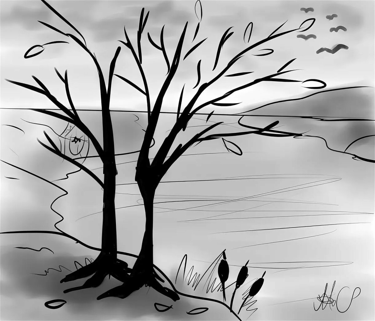 Выбираем объект будущего рисунка. Пусть это будут два дерева, растущие на взгорке у широкой реки. Первым делом намечаем линию горизонта и перспективу