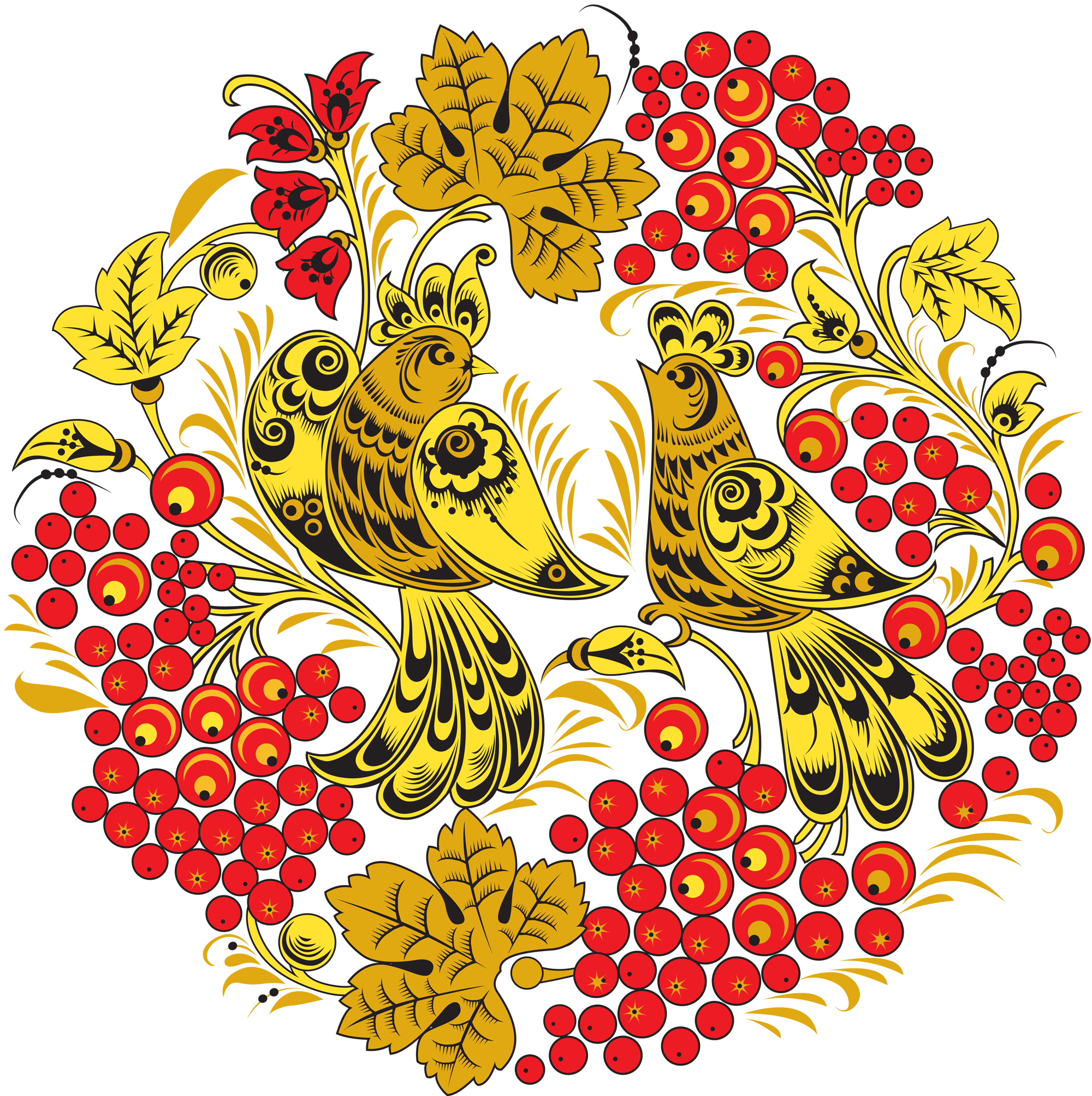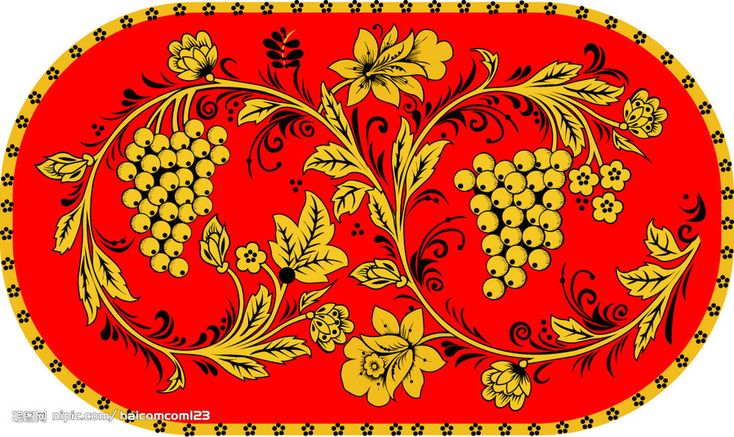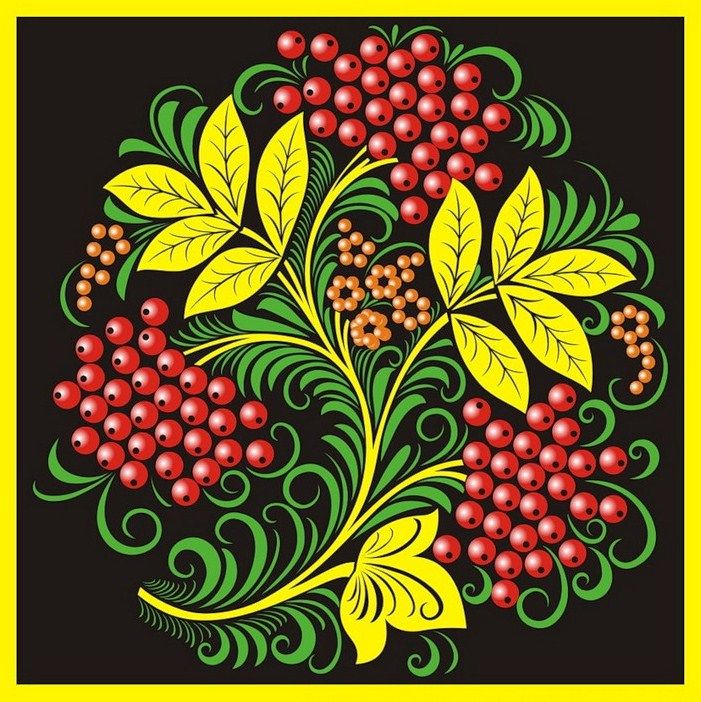 Это декоративная роспись деревянной посуды и мебели в красных, зеленых и золотистых тонах на черном фоне. Несмотря на темный фон, изображение выглядит ярким. Для создания рисунка используются такие цвета, как красный, желтый, оранжевый, зеленый и синий. Также на картинке всегда присутствует золотистый цвет. Традиционные элементы хохломы – красные сочные ягоды рябины и клубники, цветы и ветки.Также часто встречаются птицы, рыбы и животные. Предполагается, что хохломская роспись зародилась в XVII веке на левом берегу великой русской реки Волги.