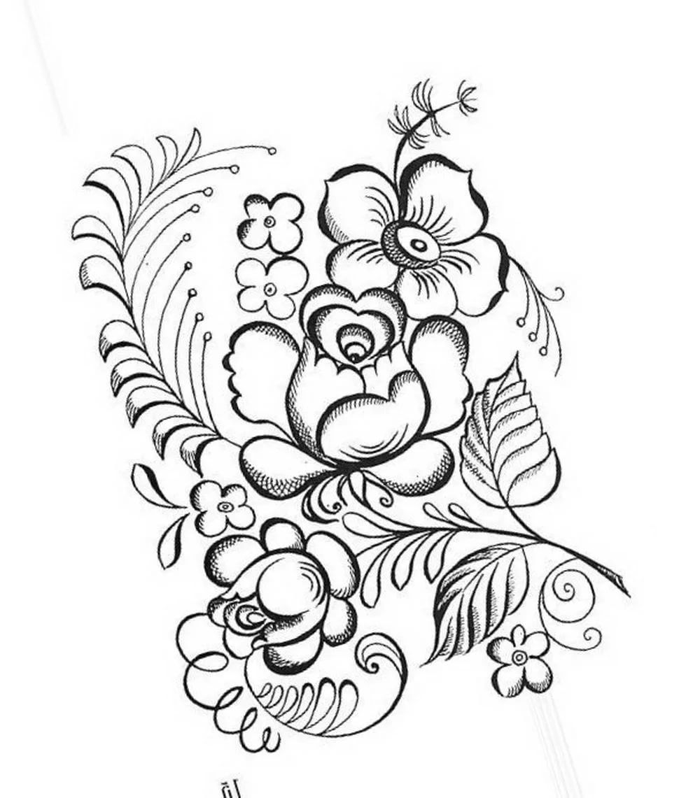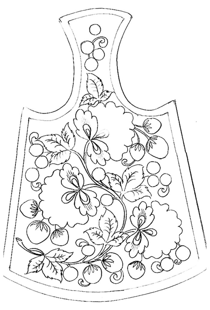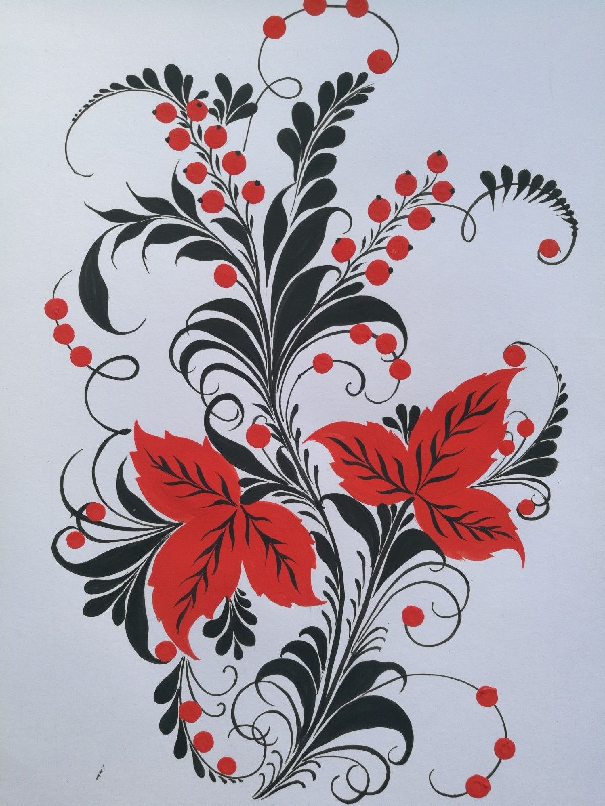 В нашем рисунке цветы, листья, ягоды будут частично расположены на белом, частично на черном фоне. Дополняющая рисунок травная роспись будет выполнена красным цветом.