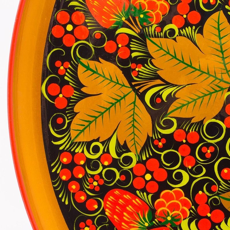 – Она сделана из дерева, одинаковые элементы узора (завитки, травка, листки, веточка с ягодами), узор выполнен на черном или желтом фоне.