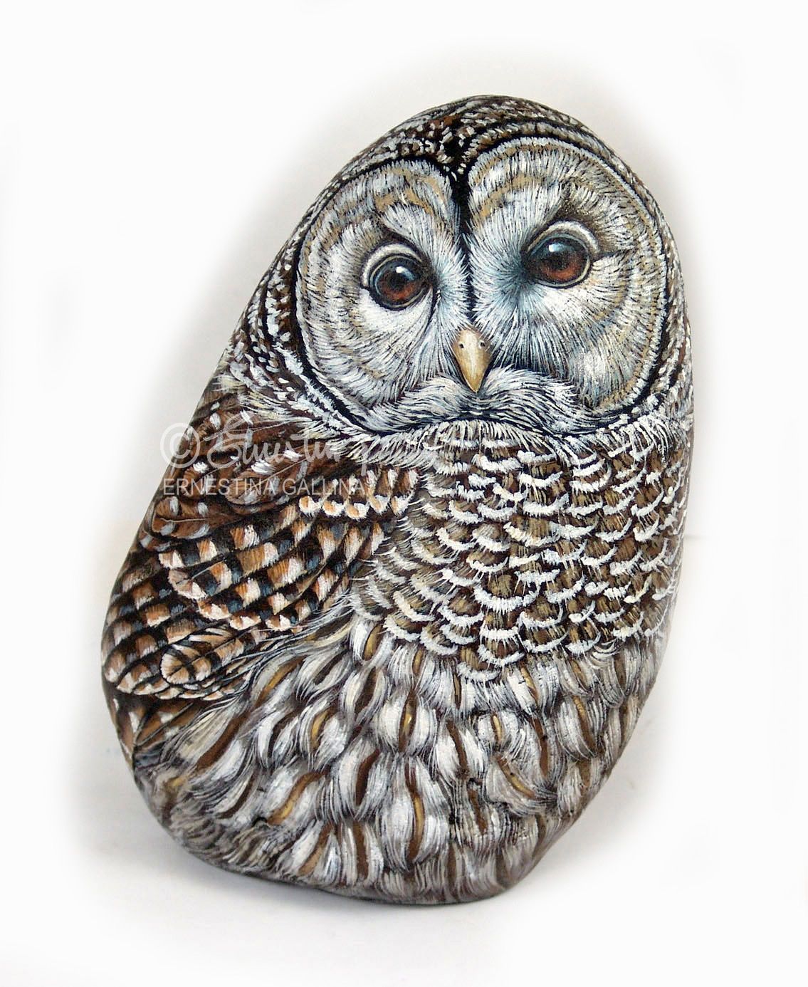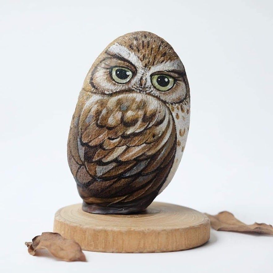 Мы не знаем, нарисованная ли это галька или настоящая сова. От пальто до глаз каждая мелочь выглядит реалистично. Это почти заставляет вас протянуть руку, чтобы прикоснуться к нему, потому что перья выглядят очень мягкими.