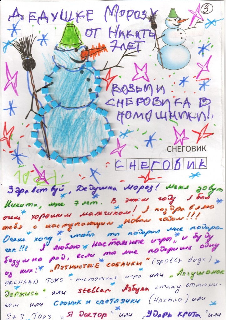 Ну, а дальше расскажите немного о себе. Что вы за мальчик или девочка, какие у вас увлечения, семья. Будет здорово, если в конвертик еще положите рисунок. Если умеете сочинять стишки или песенки, то расскажите ему об этом. И вот только после этого, необходимо у него попросить подарочек и указать причину, по которой вам необходим данный презент.