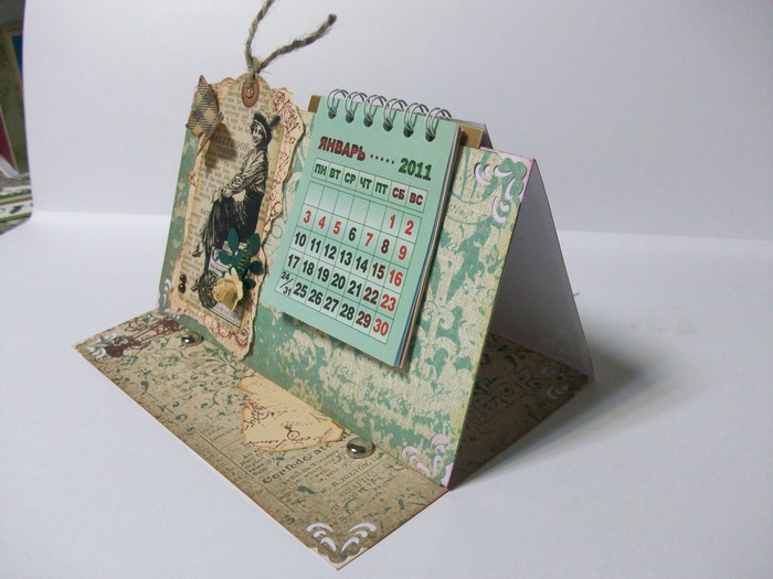 Отрезаю шнуры и собираю календарь (наблюдаю, чтобы не перепутать порядок месяцев). Шнуры оставляю чуть свободными, чтобы легко было перелистывать листики с календарными сетками. Узелки вправляю во-внутрь. Для того, чтобы конструкция была более прочной, сверху укрепляю двумя кусочками полоски картона.Кстати, если календарь не надоест за год, можно на 2014 год наклеить сверху новые календарные сетки 🙂