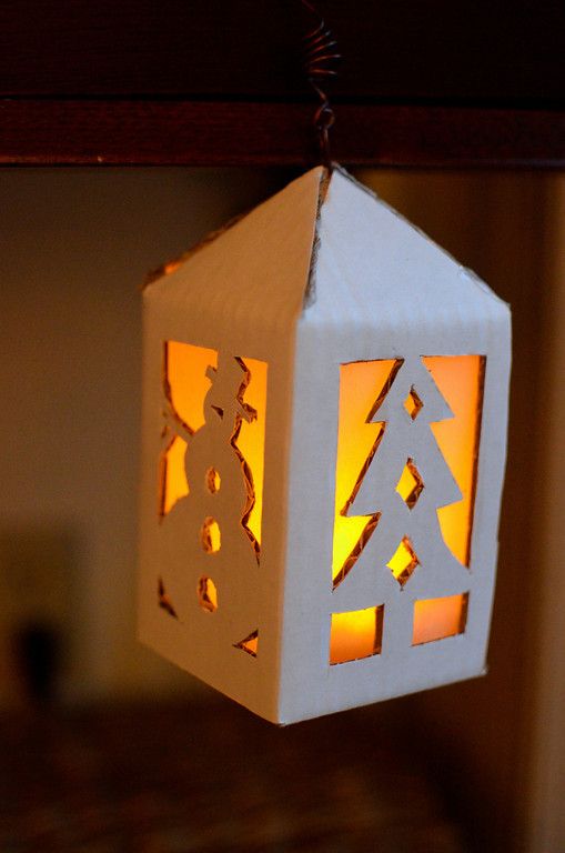 Из картона получаются красивые фонарики-домики для чайных свечек.