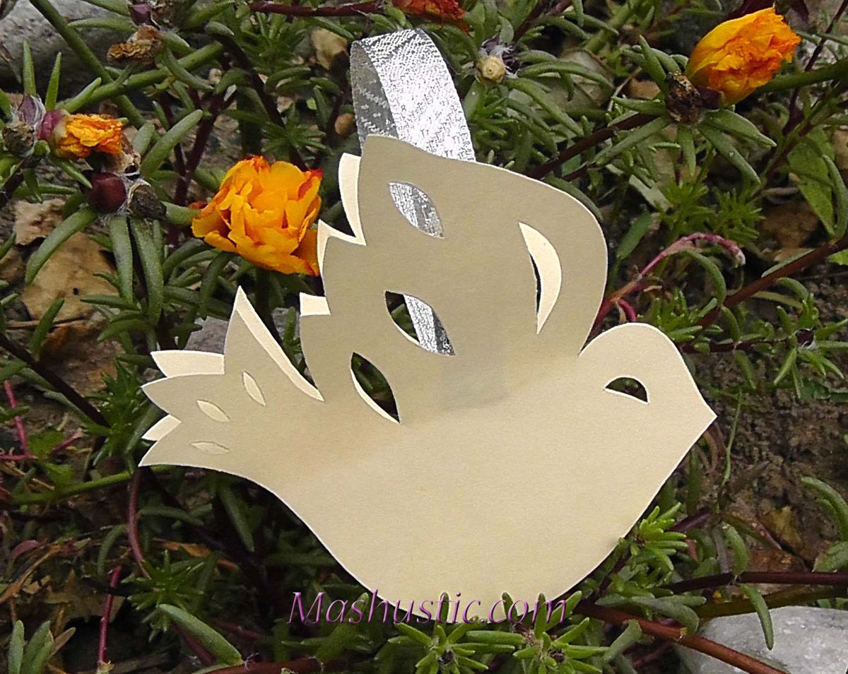 Туловище вырезается из плотной бумаги, либо картона. В верхней части спинки прорезать небольшое отверстие для всовывания бумажной гармошки – это будут крылья. Клюв покрасить в жёлтый или оранжевый цвет. На место глазика приклеить пайетку.
