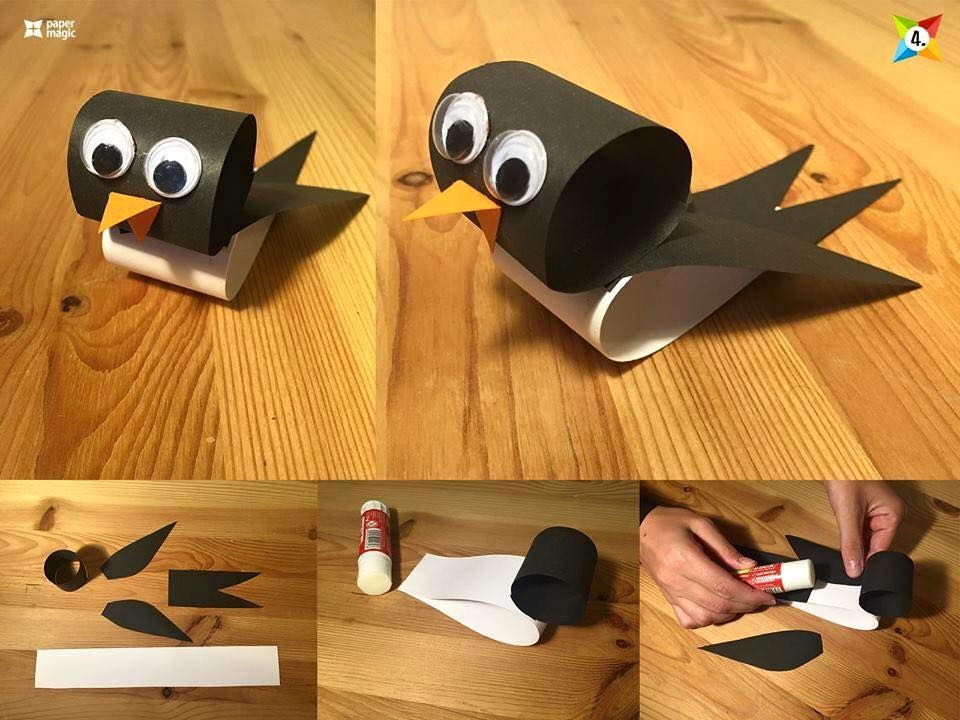 Для ножек вырежьте две тонкие полоски бумаги и приклейте их к нижней части поделки-птицы.