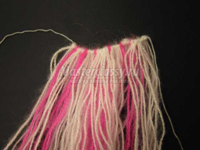 На рамочное приспособление параллельно его длинной стороне накручиваются около 60 витков пряжи основного цвета. С одной стороны нужно связать все нити ниткой того же цвета, с другой – разрезать ножницами. Аналогично готовим второй пучок нитей. Теперь берем пряжу контрастного цвета и дважды наматываем около 25 витков по короткой стороне. Так же связываем с одной стороны и разрезаем с другой. В итоге выходит два длинных пучка нитей и два пучка покороче.