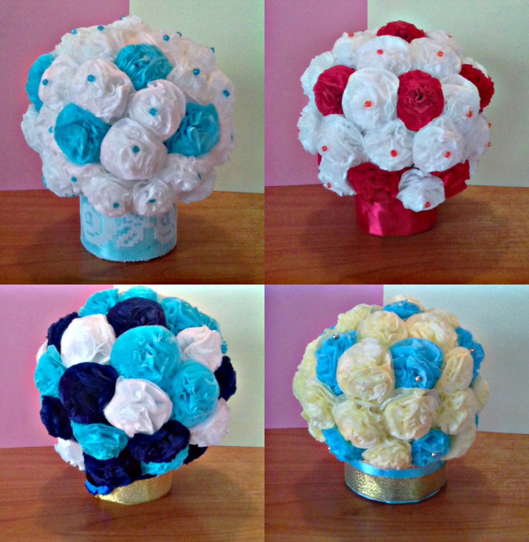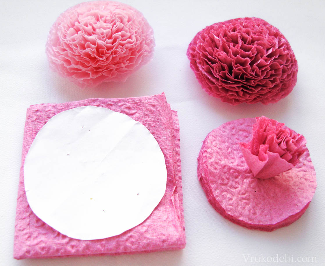 Создаём цветы по методу пиона или другим способом. Для одного цветка понадобиться несколько цветных салфетки. На занятие придётся потратить некоторое время, но оно того стоит.