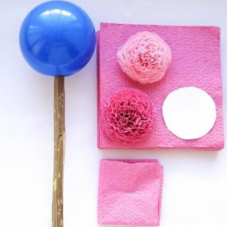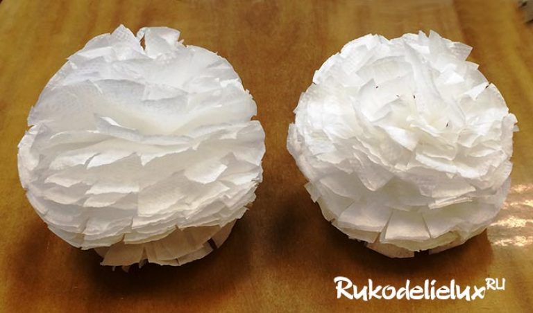 Дать шару полностью просохнуть и нанести еще два слоя из газеты, давая начало хорошо высохнуть. Пока шарик окончательно сохнет, из обычной белой салфетки нужно сделать розочки.