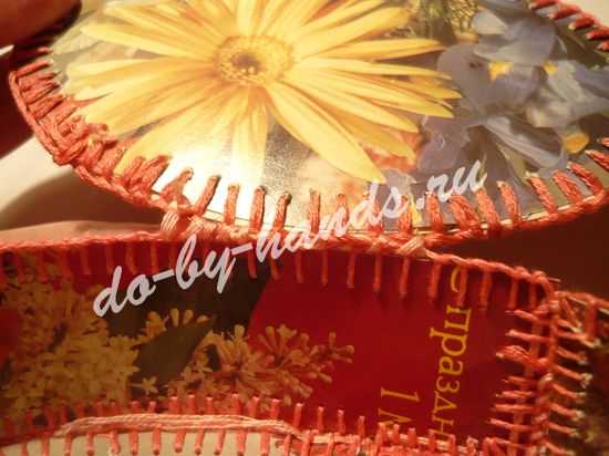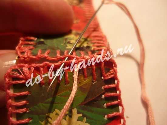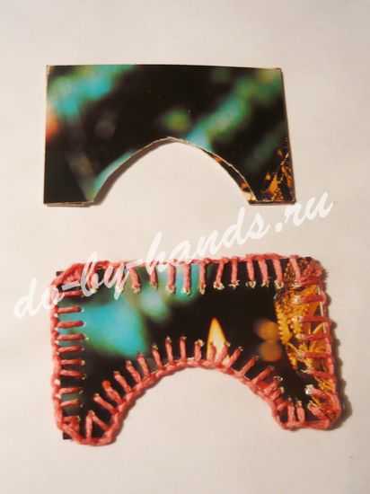Когда все детали вырезаны из открыток мы можем смело обшивать каждую деталь-открытку обметочным швом.
