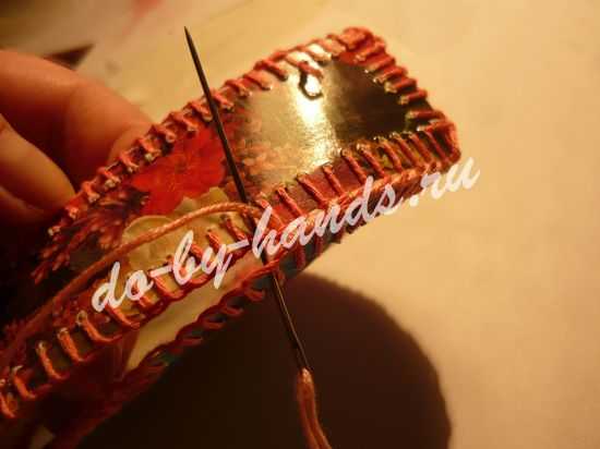 3. Вставляем в иголку плотную нитку нужного цвета, нитка для крепости должна быть взята вдвое. Обшиваем каждый элемент шкатулки (состоящий из 3-х частей) по периметру швом «через край».