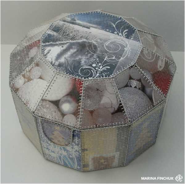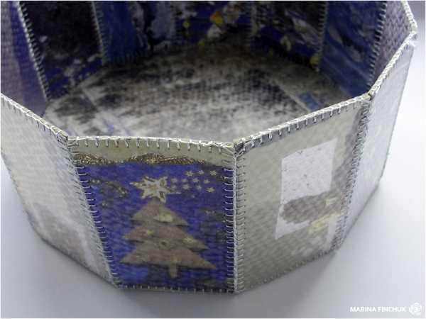 Выполняю декор деталей. С внутренней стороны – оберточная бумага + слюда, с внешней – только голографическая бумага. Дно внешне оформляю комбинировано: оберточная и голографическая бумага + слюда.