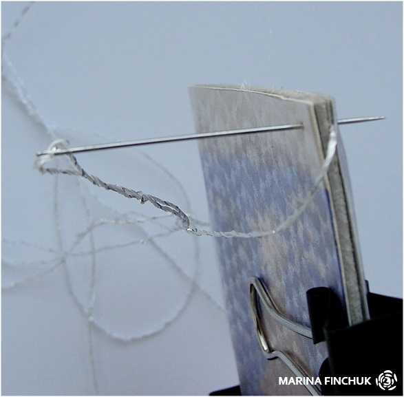 Чтобы узлы на концах нитей не портили вид готового изделия и не коробили бумагу, их прячут между слоями открыток или не делают вовсе, закрепляя нить двойным стежком на одном месте.