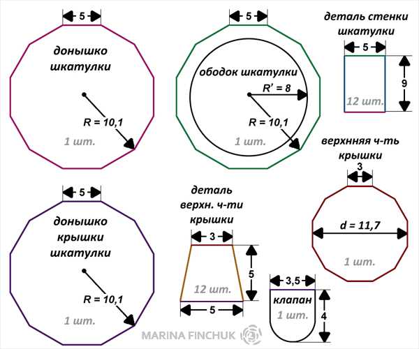 Начинаем работу над поделками из открыток своими руками с обычных выкроек. Согласно вот этой схеме у вас должно получиться 6 округлых деталей для формирования сторон шкатулки. Еще две одинаковые детали будут служить дном и крышкой.
