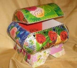 Если открыток, из которых можно было бы сделать шкатулки, под рукой нет, то можно воспользоваться вырезками из любых иллюстрированных журналов, рекламных листовок или буклетов. Чтобы такие картинки получились плотнее, их предварительно наклеивают на картон, просушивают под прессом, чтобы бумага не покоробилась.