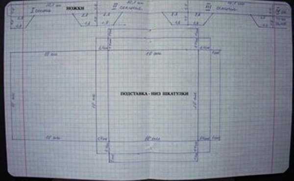 1. Выкраиваем по выше указанной схеме по три детали каждой части шкатулки. Две из них – из открытки и будут вставлены одна – снаружи, вторая – изнутри. Третья деталь из картона должна быть вставлена между ними для придания шкатулке жесткости.