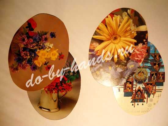 На подготовительном этапе работы создаем детали, составные части будущей шкатулки. Начертить овал на одной из открыток. По этому шаблону обвести и вырезать еще три овала. Всего четыре фигуры, по две на каждую часть шкатулки – донышко и крышку.