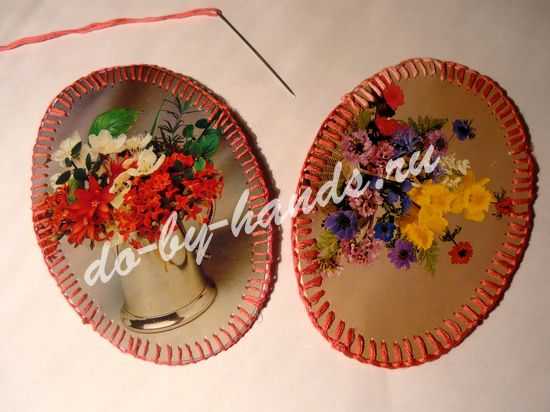 Детали складываются попарно, картинками наружу, обшиваются нитками по периметру. На фото: донышко и крышка шкатулки. Правая деталь лучше всего подойдет для крышки – удачно расположился цветочный рисунок.