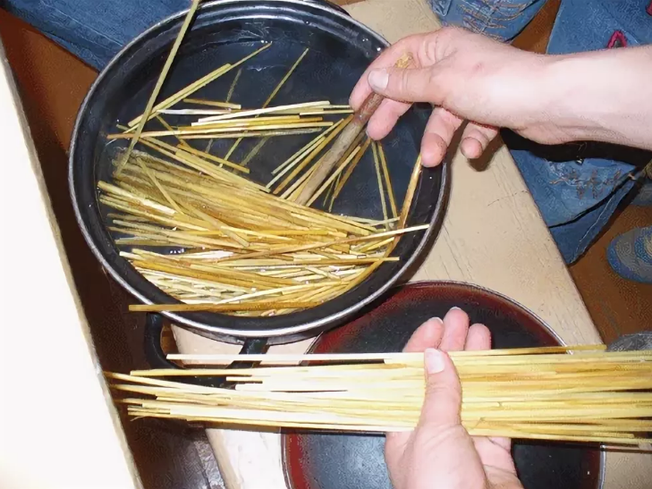 Перед созданием поделки из соломки, необходимо рассортировать соломку по ширине и длине, затем отрезать коленца, чтобы они не мешали в работе. Потом стебли кладут в посуду с кипящей водой и закрывают на сутки.