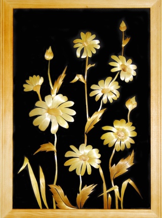 Чтобы изготовить такую аппликацию, солому готовят специальным способом: ее упаривают, то есть немного проваривают в воде на слабом огне для придания ей мягкости, а потом разрезают пополам и наклеивают на кальку или тонкую бумагу.