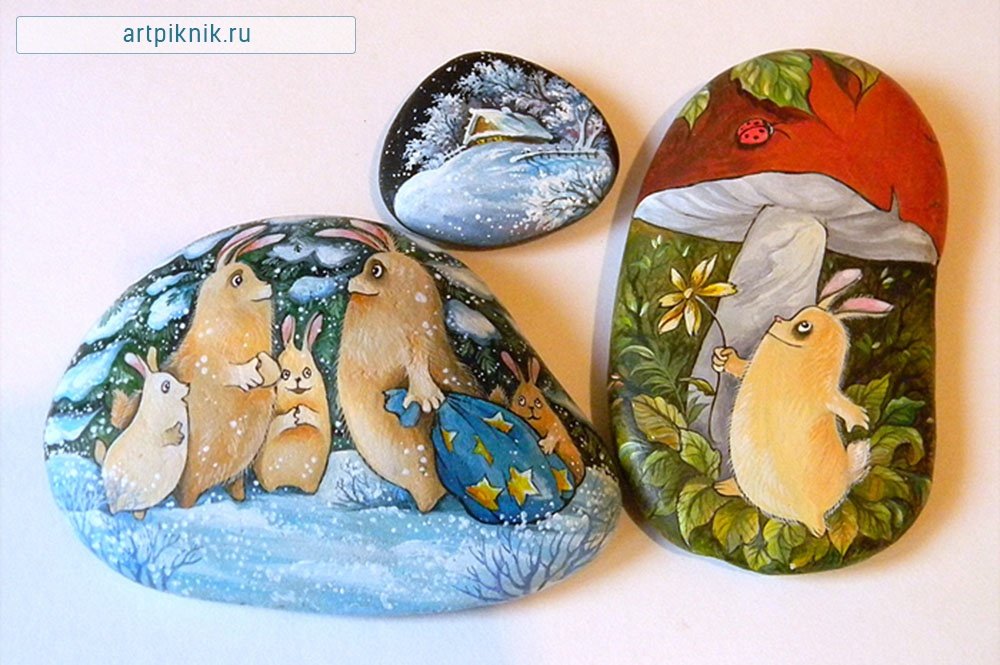 Лучше всего для разрисовывания подходят некрупные морские камешки. Они плоские, рисунок на них ложится ровно и красиво, сюжет можно выбирать на свой вкус.