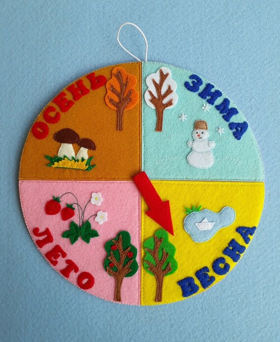 Времена года – оформила на потолочной плитке. Стрелка вырезана из лоточков от продуктов. Держится она на липучке. Передвигая ее можно указывать каждый месяц и время года одновременно.