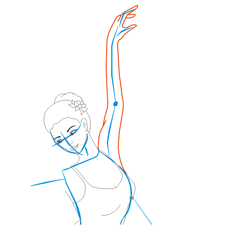 Этап 5. Вдоль верхней вспомогательной линии прорисуем руку, поднятую вверх, там где точка — изобразим локтевой сгиб, пальцы плавно отведены в сторону.