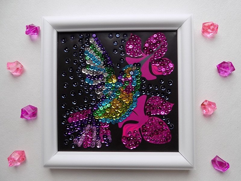 Сам процесс будет увлекательным, к нему можно приобщить всю семью или предложить собраться друзьям, чтобы сделать что-то прекрасное своими руками. Такая картина станет предметом гордости, ее можно повесить в любой комнате или преподнести в качестве подарка. Пайетки будут сверкать долгие годы, достаточно только протирать изделие от пыли.