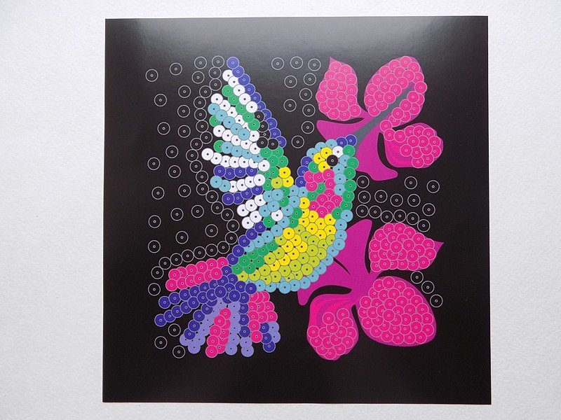 Есть и другие наборы, когда пайетки крепятся на темный фон, например, бархатную бумагу по заготовленной на ней цветовой схеме. Такие комплекты будут интересны рукодельницам более старшего возраста, так как потребуют больше терпения и усидчивости. Способы крепления в обоих вариантах одинаковые — гвоздики-пины, которые вставляются в отверстие верхнего слоя и закрепляются в пенопластовой подложке.