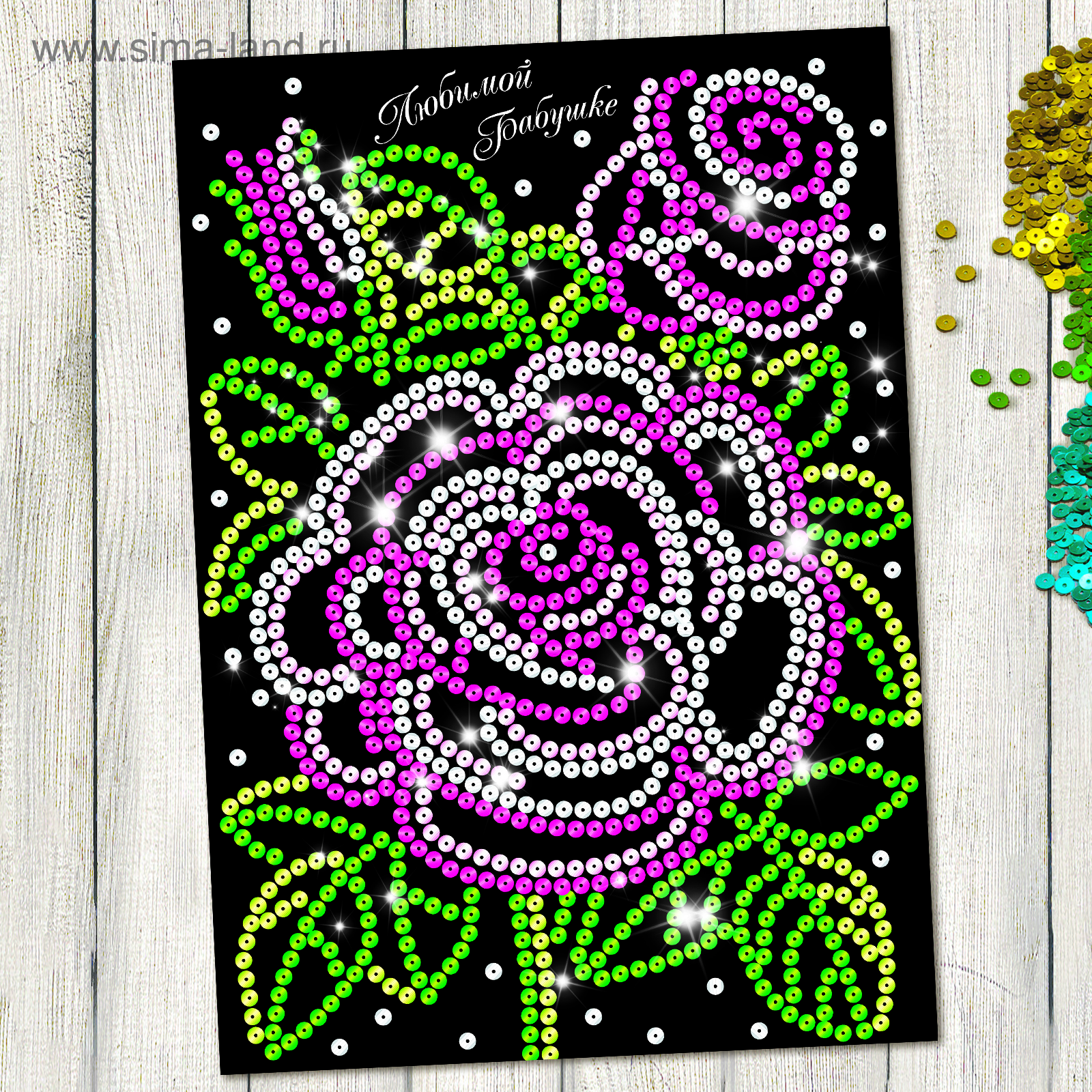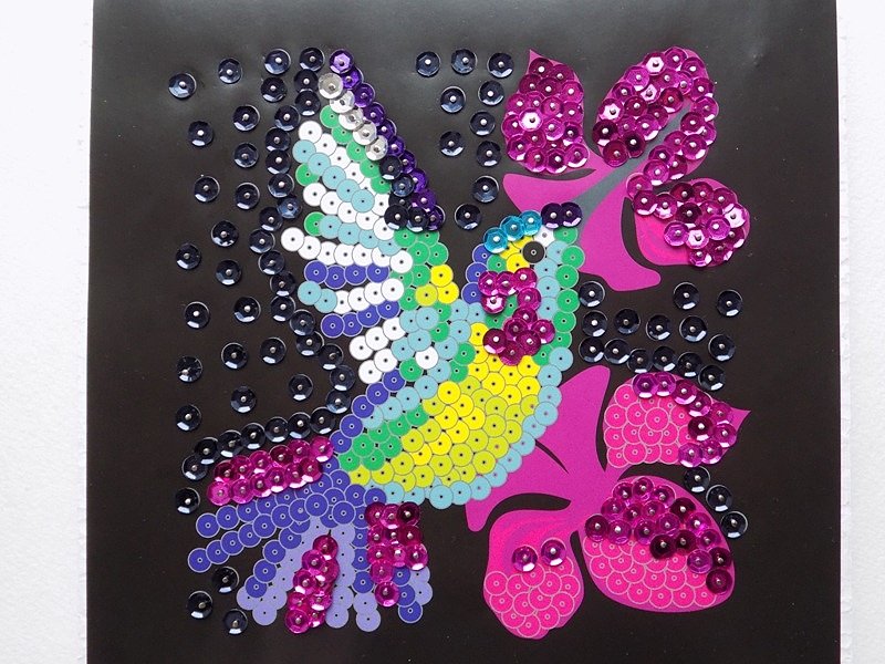 Раскладывать пайетки своими руками в виде орнамента или тематического рисунка будет интересно даже малышу. Это, кстати, и очень полезно для развития мелкой моторики.